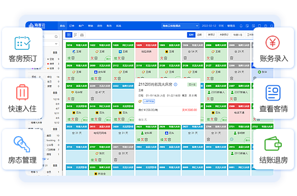 “一站式操作”理念,常用功能集中操作,前台高达95%的操作在“房态”完成,钟点房超时、空置超过指定天数抹尘提醒等,从细微处提升效率